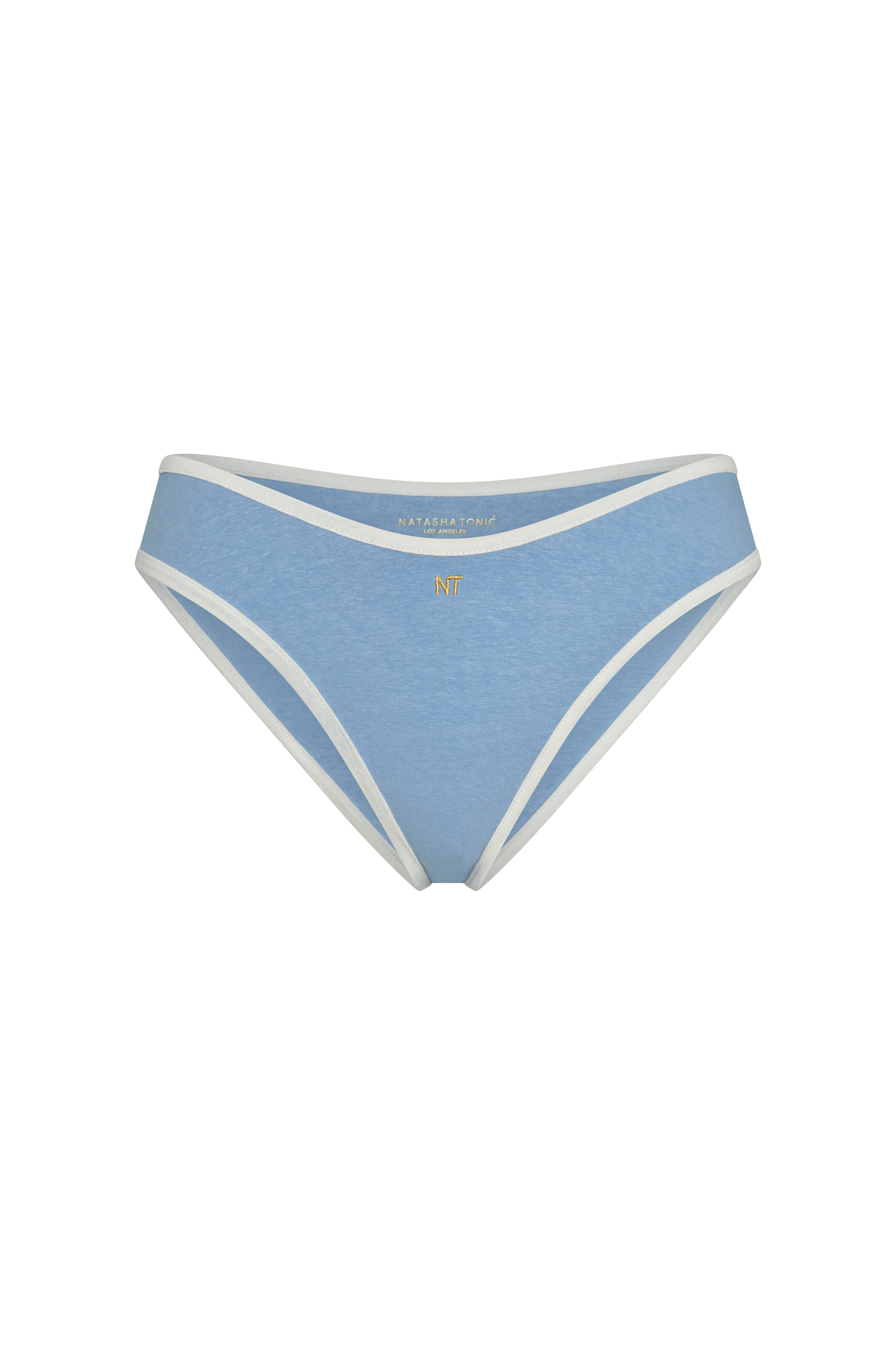 Simple bikini bottom with our special NT golden embroidered logo. Framed in an off-white border for that classy Mediterranean look. Accent is on you.