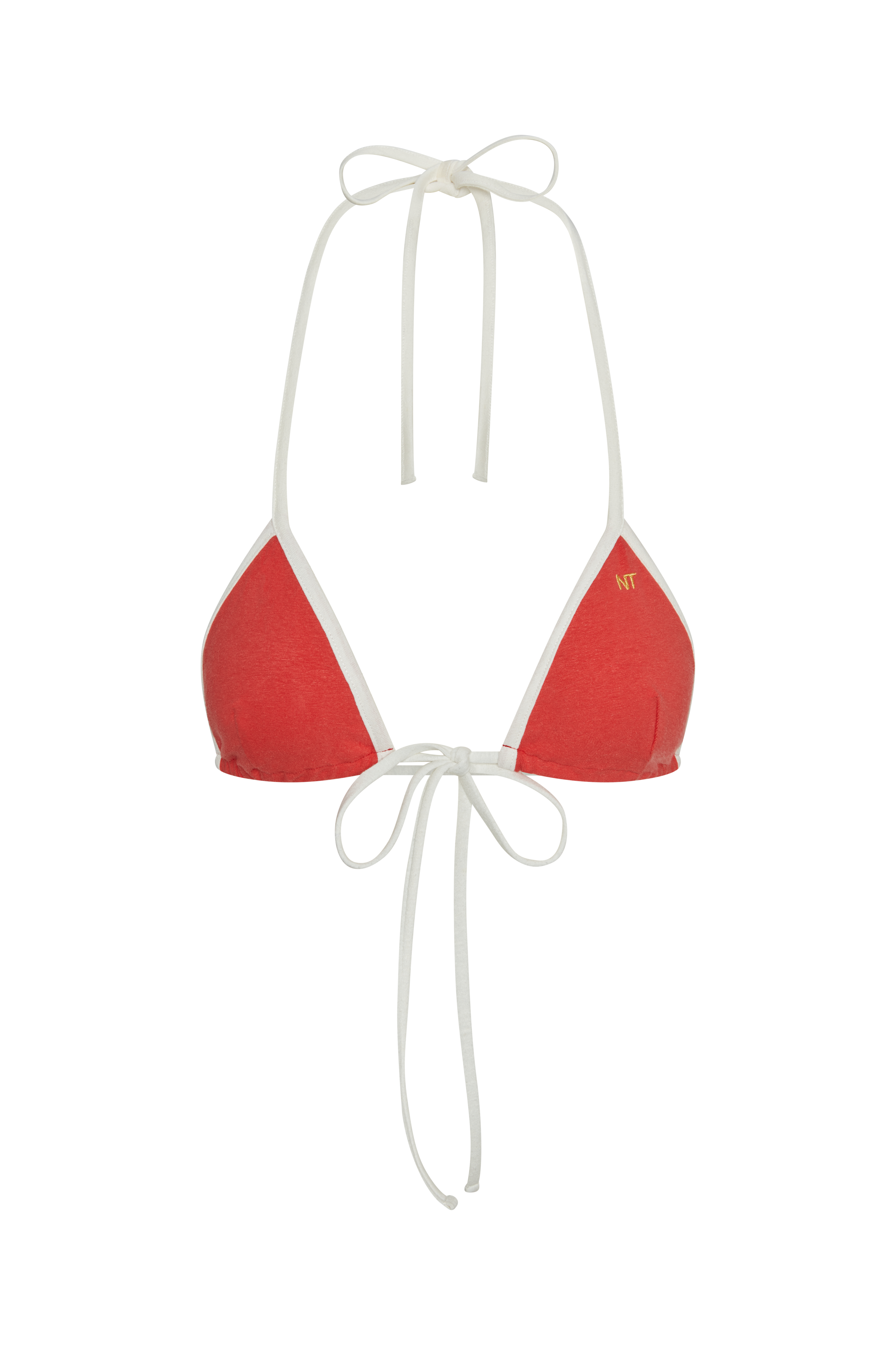 Simple bikini bottom with our special NT golden embroidered logo infront. Off white trim around the edges. Wear it as lingerie or bikini bottom. It is very comfortable and dries fast in the sun. Single layer.